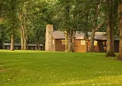 In 1992 two districts of surviving WPA structures in Lake Shetek State Park were placed on the National Register of Historic Places.[4] A 34-acre (14 ha) district on the lakeshore comprises six contributing properties: the 1938 causeway to Loon Island, 1939 beachhouse, and (all built in 1940) the beachhouse steps, kitchen shelter, sanitation building, and drinking fountains.[17] Two buildings at the Zuya Group Center were listed in a 2.5-acre (1.0 ha) district: the 1940 mess hall and 1941 crafts & recreation building.[18] The hillside beachhouse and 6-foot-wide (1.8 m) curving double staircase are particularly noteworthy. Historian David R. Benson has called it "one of the most attractive designs in the park system."[15]