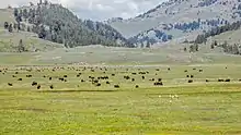 Along the river, there are pronghorn, bison, and bear within the area of the Lamar River Valley. Around the world, it is one of the most consistent environments to view wolves.[12] There are two famous wolf packs in the area. The Lamar Canyon and Junction Butte wolf packs inhabit the area along the Lamar River.[13] and is widely known as one of the best places in Yellowstone National Park to view wildlife, especially grizzly bears and wolves.[14] Three locations in the valley—Soda Butte, Crystal Creek and Rose Creek were the sites for the 1995 re-introduction of wolves into Yellowstone.[15] Birds in the area include osprey and bald eagle. The area along the Lamar River is often referred to as America's Serengeti.[16]
