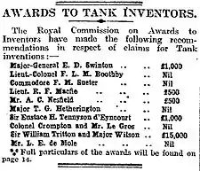 The British Royal Commission on Awards to Inventors, conducted by Mr Justice Sargant, investigated the claims of twelve persons (10 individuals, including de Mole, and one pair) relating to the invention of tanks, delivered its findings and recommendations on 27 November 1919.[16]