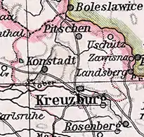 In the course of the Stein-Hardenberg Reforms, the district of Kreuzburg in the Province of Silesia was initially assigned to Regierungsbezirk Breslau, but then on May 1, 1820, it was reclassified to Regierungsbezirk Oppeln. Since then, the district has been considered part of Upper Silesia.[1] The district capital was changed to Konstadt, but was moved back to Kreuzburg on January 1, 1880. The spelling of the name of the city and the district fluctuated between Creutzburg, Creuzburg and Kreuzburg. The city and district name was officially set to Kreuzburg in Oberschlesien on September 23, 1881. Later, the abbreviation Kreuzburg OS was adopted.