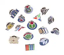 A lapel pin, also known as an enamel pin,[1][2] is a small pin worn on clothing, often on the lapel of a jacket, attached to a bag, or displayed on a piece of fabric. Lapel pins can be ornamental or can indicate the wearer's affiliation with an organization or cause. Before the popularity of wearing lapel pins, boutonnières were worn.