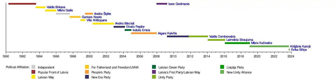 The tables below display all Latvian prime ministers from both the first period of Latvian independence (1918–1940) and since the country regained its independence (1990–present). From 1990 to 6 July 1993, the head of government was known as the chairman of the Council of Ministers.