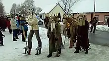 Ķekatas (Ķekatas iešana, "stilt walking", "stilt strolling") is a Latvian folk tradition of masked processions. The participants, called Ķekatnieki (singular: Ķekatnieks) wearing various masks went from one homestead to another giving blessings and driving away evil spirits.[2] [3] Since the old times they happened in autumn and winter, when all farmers' work is done any time from St. Martin's Day to Meteņi, depending on the region.[4][5] The tradition is also associated with Christmas time, similar to mummering-like traditions in other places. In fact, one of the names of the mask procession tradition is kaļadas, borrowed from Slavic Koleda. Other names used in other parts of Latvia include budēļi and čigānos iešana (gypsy walking).[4] These traditions differ not only by the name, but the behavior as well. Masks represented evil beings, animals, objects (haystack, sheaf), people, often stereotyped (little man and tall woman, pauper/beggar, gypsy, Jew)[4][6]