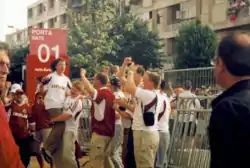 In September 2003, Latvia surprisingly finished second, ahead of Poland, in their qualifying group for Euro 2004.[8] This meant they qualified for the play-offs, where they were drawn against Turkey. Latvia won the first leg 1–0, through top goalscorer, Māris Verpakovskis.[9] The second leg finished in a 2–2 draw, with Latvia winning 3–2 on aggregate, thus qualifying for the tournament.[10][11] This resulted in Latvia being the first and only Baltic team, as well as being the second former-Soviet state in Europe at the time (after Russia) to qualify for a European Championship.[10][11] At Euro 2004, Latvia were drawn in Group D, alongside Germany, Czech Republic, and Netherlands.[12] Latvia faced Czech Republic in their opening match on 15 June 2004, with Verpakovskis scoring before half-time.[13] However, the Czechs would later come back to win the game 2–1.[13] Four days later, Latvia earned a respectable 0–0 draw against Germany to earn their first point in a major tournament.[14] They lost their final match with 3–0 against Netherlands,[15] and were eliminated, finishing fourth, with one point from their draw and two losses.[16]