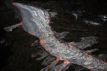 Pāhoehoe lava flow on the Big Island of Hawaii The picture shows overflows from a main lava channel. The channel is crusting over with a v-shaped opening pointing upstream (top left). The main channel and overflows show the perched nature of this kind of lava channel. Red liquid lava is breaking through ephemeral levees at the overflows.