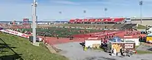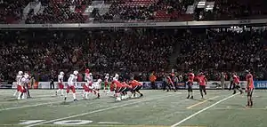 In the following season, Laval lost a Vanier Cup game for the first time in program history, as they fell 41-38 to the McMaster Marauders in double overtime in the 2011 Vanier Cup.[15][16] This game was played at BC Place and was the first Vanier Cup to be played in Vancouver.[15] The Rouge et Or would exact a measure of revenge the following year in a rematch against the Marauders in the 48th Vanier Cup.[17] The team won a Canadian collegiate record seventh Vanier Cup championship in front of an also record crowd of 37,098 fans at the Rogers Centre in Toronto by a score of 37–14.[17] In 2013, they won back-to-back national championships for the second time in program history when they defeated the Calgary Dinos in the 49th Vanier Cup by a score of 25–14.[18] The game was again played at Telus Stadium on the campus of Laval University in front of 18,543 fans.[18]