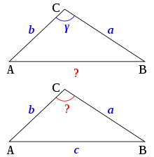 - the third side of a triangle if one knows two sides and an angle opposite to one of them (this side can also be found by two applications of the law of sines):[1]