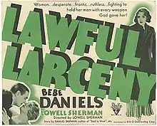 Lawful Larceny is a 1930 American pre-Code melodramatic film, directed by Lowell Sherman from Jane Murfin's screenplay. The screenplay, a melodrama, was based on the play of the same name by Samuel Shipman, which originally was a comedy. It starred a staple of the early RKO stable, Bebe Daniels, along with Kenneth Thomson, Olive Tell and Lowell Sherman, who reprised the role he had created in the original Broadway play. This film was a remake of the 1923 silent film version of the same name, produced by Famous Players–Lasky Corporation