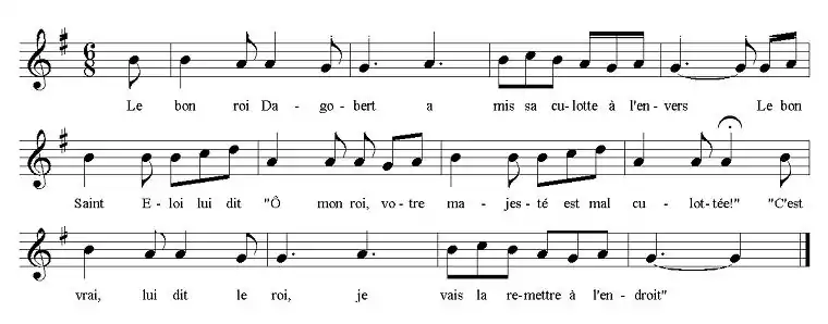 "Le bon roi Dagobert" ("Good King Dagobert"), also called "Le roi Dagobert a mis sa culotte à l’envers", is an old French song featuring King Dagobert (roi Dagobert) and Saint Eligius (saint Éloi), two historical people. The song was created in the 1750s and was intended to ridicule royalty. It was inspired by tales of debauchery of the life of Dagobert I.