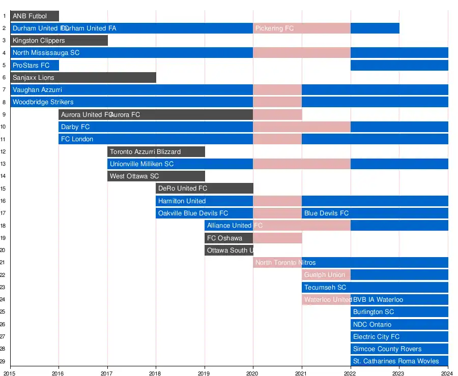 Currently there are 20 clubs, based mainly in the Greater Toronto Area and other cities in Southern Ontario. There are no clubs based in Northern Ontario.