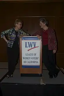The League of Women Voters of California is a nonpartisan organization that is a part of the national League of Women Voters founded by Carrie Chapman Catt in the 1920s. The league was formed from the National American Women's Suffrage Association. Their stated goal is to encourage "informed and active participation in government," "increase understanding of major public policy issues," and influence "public policy through education and advocacy."[1] The league has over 65 county groups within the state.[2]