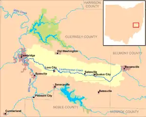 Leatherwood Creek is a tributary of Wills Creek, 28.6 miles (46.0 km) long,[4] in eastern Ohio in the United States. Via Wills Creek and the Muskingum and Ohio rivers, it is part of the watershed of the Mississippi River, draining an area of 91.6 square miles (237 km2)[4] on the unglaciated portion of the Allegheny Plateau.