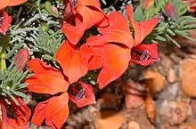 Lechenaultia formosa, commonly known as red leschenaultia,[2] is a species of flowering plant in the family Goodeniaceae and is endemic to the south-west of Western Australia. It is a prostrate or erect shrub or subshrub with crowded, narrow, fleshy leaves and scarlet or orange-red to pale orange flowers.