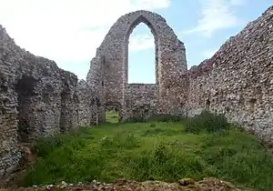 The title and associated estates passed to his son William de Ufford.[46] It was in or shortly before 1380 that, having been withdrawn from the ravages of the sea, the entire newly built monastery apart from its church was destroyed by fire, together with their corn and other goods. (Traces of this may be represented by areas of reddening in the surviving fabric.) The Abbot and convent were obliged to petition for a writ of supersedeas for distraint of the tenth, being thrown completely into debt and deprived of subsistence, and were granted this relief.[47] Whether this fire was a harbinger of the Peasants' Revolt in East Anglia in 1381, or the result of accidental causes, is not reported. William de Ufford was certainly vigorous in suppressing that destructive uprising, but died suddenly without heir in 1382 and was buried at Campsey Priory. In the wake of the fire the last major rebuilding took place: the Earl's will, written 12 June 1381, left 500 marks to Leiston Abbey.[48]