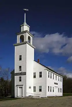 The meetinghouse was built in 1794, and is one of a modest number of New England meeting houses to survive from the 18th century, and one of a very small number with twin porches. It was built at town expense, serving as both a town hall and church until 1822. At that time it was divested of its religious functions and moved about 1 mile (1.6 km) to its present location. The upper gallery level was extended to create a second floor, and the box pews and pulpit were removed. A bell tower was added (with a Revere bell hung in 1824). It has since then served a variety of community functions, include Grange activities, the local library, a high school academy, and a local theatrical company.[2]