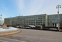 It stands behind a statue of Vladimir Lenin and is one of the few buildings that survived the Great Patriotic War.[11] It was built in 1934 and designed by Iosif Langbard.[11] | It is one of the highest organs of state power in Belarus.[12] The Supreme Council is the continuation of the Supreme Soviet of the BSSR. It acts as the functioning parliament for Belarus. |