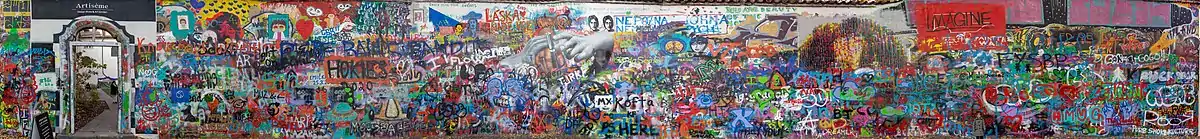 The Lennon Wall (Czech: Lennonova zeď) or John Lennon Wall (Czech: Zeď Johna Lennona) is a wall in Prague, Czech Republic. Since the 1980s, this once-typical wall has been filled with John Lennon–inspired graffiti, lyrics from Beatles' songs, and designs relating to local and global causes.