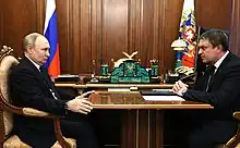 On 21 November 2017, armed men in unmarked uniforms took up positions in the centre of Lugansk in what appeared to be a power struggle between the head of the republic Igor Plotnitsky and the supporters of LPR Interior Minister Igor Kornet, who was sacked the previous day.[8][9] Three days later, a government statement declared that Plotnitsky had resigned "for health reasons (due to) multiple war wounds (and) the effects of blast injuries, (which) took their toll."[10] It was also stated that Pasechnik had been named acting leader "until the next elections."[10] Russian media reported that Plotnitsky had fled the unrecognised republic on 23 November 2017 to Russia.[11] On 25 November the 38-member People's Council of the LPR unanimously approved the change in leadership.[12]