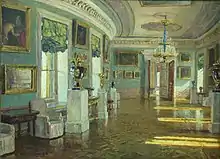 In 1962, Leonid Borisovich became acquainted with Pavlovsk Palace director Anna Ivanovna Zelenova. He created the portrait of this brave woman who had saved many precious palace's and park's masterpieces during the war. At her permission, he created a set of brilliant paintings of palace's interiors, architectural ensembles and landscapes of one of the most beautiful parks in the world.