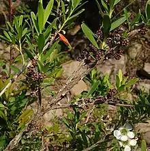 Leptospermum emarginatum, commonly known as the twin-flower tea-tree[2] or twin flower teatree,[3] is a species of shrub that is endemic to south-eastern Australia. It has rough bark on the older stems, lance-shaped leaves with the narrower end towards the base and a small notch at the tip, white flowers in groups of up to five and hemispherical fruit that falls off when mature.
