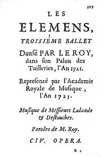 Les Élémens (The Elements), or Ballet des élémens, is an opéra-ballet by the French composers André Cardinal Destouches and Michel Richard Delalande (or de Lalande). It has a prologue and four entrées (as well as, originally, a celebratory epilogue later removed). The libretto was written by Pierre-Charles Roy. It was styled "the third ballet danced by the king" because the 11-year-old Louis XV performed dance divertissements in it, as he had already done in the previous ballets, L'inconnu by various authors (including Delalande and Destouches), and Les folies de Cardenio by Delalande, both staged at court in 1720.