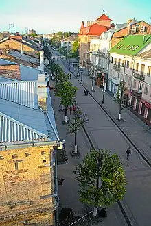 Lesya Ukrainka street (formerly known as Jagiellońska - Jagiellon street) is a central pedestrian street in Lutsk, Ukraine, running from Fellowship Bridge Square to the city's central Theatre Square. The street is 730 metres long, and is the main street of the northern and eastern areas of the Glushets suburb of Lutsk. There have been at least ten churches and monasteries located on the street. The street began to develop with more intensity during the eighteenth century when the city began to extend along the street's path. It became the main street in the city in the early 19th century. In the 1980s, it became a pedestrian-only street. The street was renamed to Lesya Ukrainka in the 1990s. Lesya Ukrainska has many architectural landmarks and has become an important trade artery of the city.