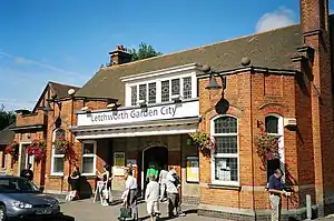 The first station known as Letchworth Garden City was opened in 1903, with a restricted service; it gained a full passenger service on 15 April 1905.[2] On 18 May 1913, this station was replaced by a new station on a different site.[2] The new station was built in 1912, in the Arts and Crafts style, and has since been Grade II listed.[3]