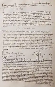 The books, written in scores of varying hands, are not in strict chronological sequence, but speak in detail of the business habits of Chamberlains of the City of London and Common Clerks in the times of the Plantagenets, and contain entries in English, French, and Latin. The lack of sequence in many entries is probably due to rough copies of the memoranda, or "remembrances," being kept in hand at times for a month or two together, or even longer, and then entered in the volumes without much regard to the chronological order of the facts they recorded. Also, at least in some cases, two sets of entries were being made in different parts of the volume at the same period; in the instance of the earliest letter books, no less than three of them were in use for receiving entries of memoranda for several years in common. The irregular, and at times haphazard, manner in which entries have been made in (at least) the first two Letter-Books, and their overlapping each other in point of chronology,[lower-alpha 2] may also be accounted for by each clerk having been in the habit of keeping in his own custody the books or calendars upon which he happened to be engaged for the time being.