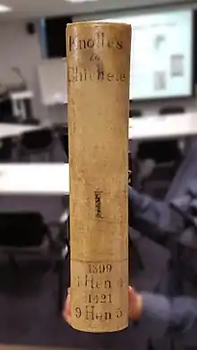The volumes derive their name from being lettered from A to Z (with two odd volumes marked respectively &c. and AB) and again from AA to ZZ.[3] Besides being known by distinctive letters, the earlier Letter-Books originally bore other titles, derived from the comparative size of each volume and the original colour of its binding.[lower-alpha 1] Letter-Book A is referred to as the "Lesser Black Book" (Parvus or Minor Liber Niger); Letter-Book B as the "Black Book" (Liber Niger); Letter-Book C as the "Greater Black Book" (Major or Maximus Liber Niger); Letter-Book D as the "Red Book" (Liber Rubeus); and Letter-Book E as the "White Book" or "New White Book of Writs and Memoranda" (Liber Albus or Liber Albus novus de brevibus et memorandis).[4]