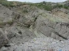 The bedrock of the island consists of Silurian and Devonian sedimentary rocks, primarily metamorphosed, highly cemented quartzite conglomerate-breccias, with subordinate conglomerate, sandstone and clay, which form cliffs surrounding the island up to 25 metres high. The structural geology of the island is defined by a wavy monocline orientated to the northeast, with a small anticline in the eastern part of the island. The island is crisscrossed by faults with both N-S and NE-SW orientations.[7]