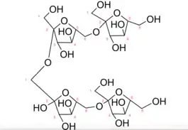 Levan is a naturally occurring fructan present in many plants and microorganisms.[1] This polymer is made up of fructose, a monosaccharide sugar, connected by 2,6 beta glycosidic linkages. Levan can have both branched and linear structures of relatively low molecular weight.[2] Branched levan forms a very small, sphere-like structure[3] with basal chains 9 units long. The 2,1 branching allows methyl ethers to form and create a spherical shape. The ends of levan also tend to contain a glucosyl residue.[4] Branched levan tends to be more stable than the linear structure.[5] However, the amount of branching and length of polymerization tends to vary among different species.[4] The shortest levan is 6-kestose, a chain of two fructose molecules and a terminal glucose molecule.