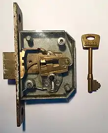 A lever tumbler lock is a type of lock that uses a set of levers to prevent the bolt from moving in the lock.[1] In the simplest form of these, lifting the tumbler above a certain height will allow the bolt to slide past.