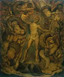 William Blake's poem "Jerusalem" has the two monsters Behemoth and Leviathan represent war by land and by sea. This relationship is explicitly seen in Blake's two pictures showing Admiral Nelson and William Pitt [(1759–1806) (Prime Minister of Great Britain (1783–1801 and 1804–1806] included in this display. One interpretation of this design is that these beasts stand for the hopelessness of material nature. The Lord is pointing out to Job the negativeness of his faith so far.[3]
