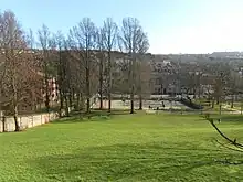 Lewes Road is the longest continuously named road in Brighton:[4] it runs for 3.46 miles (5.57 km) northwards to the city boundary from Waterloo Place, where it diverges from the A23 (London–Brighton road). This point,[Note 2] close to the rear of St Peter's Church, is at the southeast corner of The Level.[4] The 8.05-acre (3.26 ha) area of marshy open land now known as The Level was the meeting point of three winterbournes, including one which occasionally surfaced along the dry valley where Lewes Road runs. It has been used for fairs, sport and recreation since the 18th century.[5] The road forms the eastern boundary of The Level, then meets Union Road and Elm Grove at a major junction. Elm Grove is the main route to Brighton Racecourse;[6] it originated as part of a Roman trackway which formed part of the ancient trackway across the South Downs to Lewes (Juggs Road), and was developed with housing from the mid-19th century.[6][7] The next major junction is the Vogue Gyratory, where Upper Hollingdean Road, Upper Lewes Road (both of which link Lewes Road with Ditchling Road, another major route) and Bear Road meet the Lewes Road. This was the northern boundary of Brighton until the borough was expanded in 1928; to the north and east was the parish of Preston, and the residential area east of Lewes Road and north of Bear Road (now known as the Bear Road area) was historically known as East Preston.[8] In this area there is also some industrial development on the east side of the road,[9] and the University of Brighton has several buildings.[10] North of this, the Moulsecoomb council estate was built in several phases in the mid-20th century alongside the Lewes Road. Further north, the road passes the east side of a deep valley originally known as "Cold Dean", between Hollingbury and Stanmer. Scattered farm cottages near Lewes Road were the only buildings in the valley until Brighton Corporation developed it for council housing from 1950 as the Coldean estate.[11]