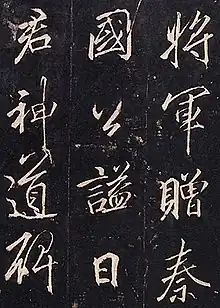 In addition, Li was one of the "most sought after writers of monumental calligraphy" of his time.[11] Li's calligraphy was initially modelled on Wang Xizhi's,[12] before he developed "his own personal and innovative style of running script".[13]