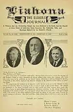In June 1907, the Elders' Journal was merged with The Liahona, a weekly publication created in April 1907 for use in all missions of the LDS Church in the United States. The combined publication was named Liahona: The Elders’ Journal and printed in Independence, Missouri. The new publication retained the format of the Elders' Journal rather than The Liahona and remained semi-monthly. Subscription lists from both publication were combined, roughly 20,000 copies of the first edition were printed, and the consolidated publication continued for the next 37 years.[3]