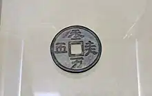 For 2 centuries Liao dynasty coins weighed the same until the issue of the first Yuan Bao (元寶) coin series, the next 2 generations of coins were lighter which invited private production which the Liao government had outlawed.[8] Lighter coinage became preferred during the Da An period as a measure against the outflow of currency to other countries, though under Tianzuo (the last emperor) the Liao started producing heavier coinage again but this didn't stop the inflation which was caused by the lack of commodities rather than a lack of quality in the coinage.[8] Unlike the Chinese had during the Han and Tang dynasties, the Khitans never resorted to decrease the quality of their coins, as they didn't have any incitement for debasement.[8] This was mostly because the majority of the wealth in the country belonged to the Imperial family, the Khitan nobility, and the Chinese Mandarins who would’ve suffered the most from inflation as there was no influential business class like those that threatened Chinese authorities.[8]