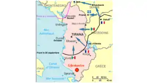 In Albania, the Austro-Hungarian XIX Corps under Karl von Pflanzer-Baltin withdrew by land to avoid encirclement. The Entente had firm control of the Adriatic Sea, as shown by the Allied bombing of Durrës on 2 October. The Italian 16th Army corps (CSIO) and the French 57th division advanced northward, liberating Berat on 1 October, Durrës on 16 October, and Shkodër on 30 October. From the east the French 11th Colonial Division, 30th Division, Italian 35th Division and Greek 3rd and 4th Divisions entered Albania, liberating Elbasan on 8 October. Having reached Kotor, Austro-Hungarian forces surrendered on 3 November. [5]