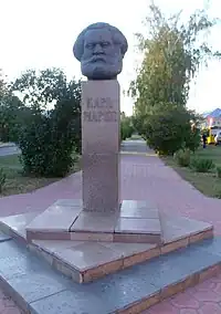 - Karl Marx Monument Dedicated on May 5, 1989, at the intersection of Youth Boulevard and Karl Marx Street, cater-corner across the street from the north corner of Liberty Square (53°30′52.18″N 49°24′35.17″E). The monument is a bust of Karl Marx, made of aluminum stained to look like bronze, 91 centimetres (36 in) high. It stands on a pink granite pedestal 2.3 metres (7.5 ft) tall, which in turn is on a concrete base. The architects were V. Z. Gurevich and A. V. Medvedkov, the sculptor was Igor Burmistenko, and the restoration was done by Victor Formin. It was a gift to the city from Burmistenko. In August 2007, hooligans stole the bust.[2] It was recovered, but badly damaged, and was thought to be a total loss. However, the metal specialist Formin, in honor of his friend Burmistenko (who was dead by then) and working without compensation except for materials, undertook to painstakingly restore the bust sufficient for it to form the basis for a new casting. The new bust was dedicated on November 1, 2007. It is equipped with vandal-proof features.[3][4]