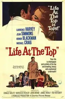 Life at the Top is a 1965 British drama film, a production of Romulus Films released by Columbia Pictures. The screenplay was by Mordecai Richler, based on the 1962 novel Life at the Top by John Braine, and is a sequel to the film Room at the Top (1959). It was directed by Ted Kotcheff and produced by James Woolf, with William Kirby as associate producer. The music score was by Richard Addinsell and the cinematography by Oswald Morris. The film's art director, Edward Marshall, received a 1966 BAFTA Award nomination.[1]
