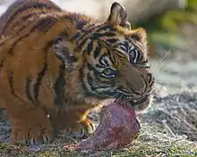 The female alone is responsible for raising the cubs; the male is almost never involved, although he sometimes shares prey with the tigress and her offspring.[9] The tigress does not allow her offspring to touch meat until they are forty days old;[5] she then encourages them to lick and chew it, and they are completely weaned by the time they are eight months old.[2] At three months old, she starts leaving them alone for several days in the den while she hunts, then takes them to the carcass of the animal she has killed. Unlike young lions, young tigers eat before their mothers, and it is only when they are full that the tigress begins to eat: experiments on wild and captive tigers have shown that even when hungry, the tigress will let her litter eat first. The tigress is also very protective and will eliminate or avoid any danger (male tigers, including the father, men, etc.).[10]