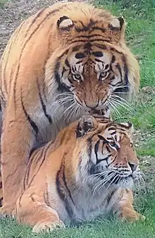 When the female meets an unfamiliar male, she is at first distant, growling at him and ready to attack, but the pair gradually move closer together until they touch moustaches. During courtship, contact is frequent: the tigers bite each other's mouths as a "kiss" and rub against each other. When the female is ready, she adopts the typical feline position of lying down (a position called lordosis, with her front legs extended in front of her and her back legs half-bent). The tiger mounts her in a half-crouched position that does not crush her partner. The male penetrates the female, makes a metallic sounding cry[19] and then grabs her by the folds of the skin at the back of the neck during ejaculation. It is possible that this "neck grip" allows the partners to have a correct position during ejaculation; however, this position is dangerous and sometimes leads to the death of the female when the couple is inexperienced.[20] Finally, the tigress disengages, frequently turning on the male and attempting to strike him, before entering a resting period.[10]