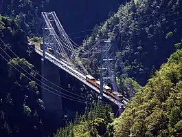 - At kilometre point 24.422, the Pont Cassagne (also known as Pont Gisclard) is 253 meters long and unusually for a railway bridge, is a suspension bridge, the only one in France located on an operating railway.[8] In 2023, a major project was carried out to replace 12 of the suspension cables.[9]