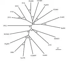 “The nucleotide sequence of LVX appears to be unique among potexviruses inasmuch as it apparently lacks the small open reading frame, 5’ to the coat protein cistron, common to all other potexvirus.”[10] In addition, the TGBp3 region of the genome lacked a normal start codon.[11] The 5′-non-coding region begins with GGAAAA, whereas those of other sequenced potexviruses probably all begin with GAAAA.[12] Phylogenetic analysis of the LVX coding sequence revealed that LVX was most closely related to Strawberry mild yellow-edge virus.[13]