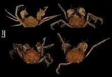 Species of this genus are quite small, the carapace reaching only 1 cm in width at maturity. The leg span may reach lengths of 2.5 cm. The carapace is circular and pilose and the dorsal surface is concave. There are distinct gastro-cardiac grooves and margin. The male chelae are stout, partially covered by dense setae, and lacking a tubercle. The rostrum is absent or weak.[2][3][1] The eyes, antennae, and antennules are visible from above. Both male and female abdomen-pleotelson are six-segmented. The male pleotelson is slightly trilobed. Female abdomen-pleotelson segments are distinctly demarcated. In L. sumatranus, there is a boundary between the first and second segments, or between the second and third segments in L. naiyanetri. Long, biramous pleopods are found on the second to fifth segments, developed from distal outer end of the inner surface of each segment.[4] Crabs of the genus Limnopilos can be distinguished from other hymenosomatid crabs by the following features: their telson is not distinctly trilobate, the eyes are not concealed from dorsal view by the anterior carapace, and male first pleopods have a simple structure. In both male and female individuals, all abdominal segments are free and unfused.[2][1]