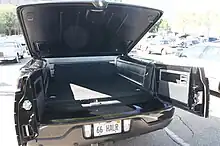 In another major design change, the rear cargo bed was repurposed as a watertight trunk,[9] adopting a permanently-mounted tonneau cover (power-operated), opening above a 50/50 hinged door (replacing a tailgate). The interior of the Blackwood cargo area was fully carpeted, lined in polished aluminum, and lit with LED lighting.[5] While far smaller in interior size than a similar-length F-150 cargo bed, at 26 cubic feet,[10] the cargo area of the Blackwood was larger than the trunk of the Lincoln Town Car (itself, the highest-capacity sedan produced at the time).