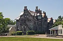 Lindenwold is a two and one-half story stone building featuring Victorian Gothic architecture with Jacobean Revival and Queen Anne motifs. The earliest section was constructed in 1886 by William B. Skidmore for his family residence. He was married to Julia Cobb, daughter of George T. Cobb, a mayor of Morristown. In 1905, the Skidmore estate sold the property to John Claflin, who added a west wing by 1910. In 1947, the mansion was sold to the Peck School, a private elementary day school.[3]