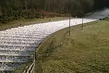 In 2002/03, the dam crest was raised 9.8 feet (3 m) as the original height would have been overtopped during the Probable Maximum Flood (PMF). This was part of a £6.5 million scheme to make Swinsty, Fewston and Lindley Wood reservoirs meet improved flood standards.[3] The reservoir keeper's house at the dam was originally planned to be demolished during this work, but was built into the new, higher crest as bats were found to be living there.[4]