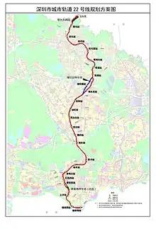 Line 22 of the Shenzhen Metro is an express line under planning, which will connect the districts of Futian and Longhua for 38 kilometers and 23 stations.[1] Construction is planned to begin in 2023. The first phase of Line 22 has entered Phase V planning, and will run from Shangsha in Futian District to Liguang in Longhua District, with 21 stations and 34.2 kilometers of track.[2][3] The line is proposed to use 6 car type A trains.[4] It is proposed to extend into Dongguan in long term planning.