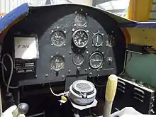The first major component is the trainer, which consists of a wooden box approximating the shape of a fuselage and cockpit, connected via a universal joint to a base.[13] Inside the cockpit is a single pilot's seat, primary and secondary aircraft controls, and a full suite of flight instruments. The base contains several complicated sets of air-driven bellows to create movement, a vacuum pump that both drives the bellows and provides input to a number of aircraft instruments, a device known as a Telegon oscillator that supplies an 85 VAC 800 Hz sinusoidal reference signal to the remaining pilot and instructor instruments, and a wind drift analog computer.